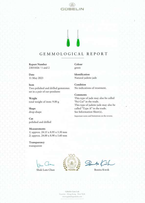 Gübelin, 2023, report no. 23051026/1 and 2: natural jadeite jade (Fei Cui), no indications of treatment, Type A