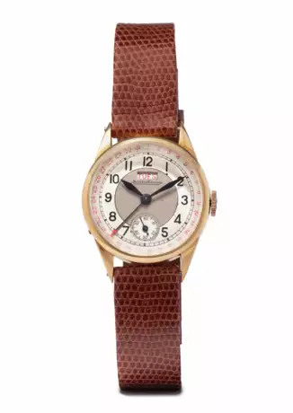 Ref. 2701. Glattes 750 Gelbgold-Gehäuse, 30 cm. Gehäuse Nr. 39948, nicht signiert. Zweifarbiges Zifferblatt mit schwarzen arabischen Zahlen, Eisenbahnminuten, roter Datumsring, in Guichet rote Wochentag-Anzeige bei 12 Uhr, kleine Sekunde bei 6 Uhr. Gebläute Schwertzeiger. Datum durch seitlichen Drücker am Gehäuse einstellbar. Handaufzug-Formwerk Kal. 412, Werk Nr. 115730. Schraubenkompensations-Unruh mit gebläuter Spirale und Rückerzeiger. Neuwertiges Lederband mit originaler Gelbgold-Dornschliesse. Funktiostüchtig. Mit Echtheitszertifikat, Rechnung und Zertifikat von Beyer, 2016.