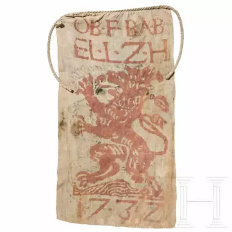 Beidseitig bedrucktes Leinentuch. Auf der Schauseite ein heraldischer Löwe unter den Initialen des Landgrafen Ernst Ludwig von Hessen-Darmstadt (1667 - 1739), auf der Unterkante auf 1732 datiert. Rückseitig ein Türkenkopf in Schwarz. Ein Riss, genäht. Maße ca. 75 x 42 cm.