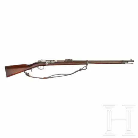 Cal. 11,15x60R M71, SN. 4426A , nummerngleich inkl. Schrauben und Schloss. Partiell leicht rauer Lauf. Fertigung 1874, Indienststellung 1875. Klappen-/Rahmenvisier. Laufwurzel signiert "OESTERR.WAFFFB.GES.". Div. kaiserliche Abnahmen, Truppenstempel "7.P.1.108" (Westfälisches Pionier-Bataillon Nr. 7 in Köln). Schloss und Hülse blank. Brünierung und Bräunierung der Metallteile noch gut erhalten. Nussholzschaft mit tiefen Abnahmestempeln, Entladestock und Repro-Riemen. Schaft und Metallteile sind mit Zaponlack überzogen (läßt sich leicht entfernen). Eine gut erhaltene, seltene Sammlerwaffe. Länge 123 cm.