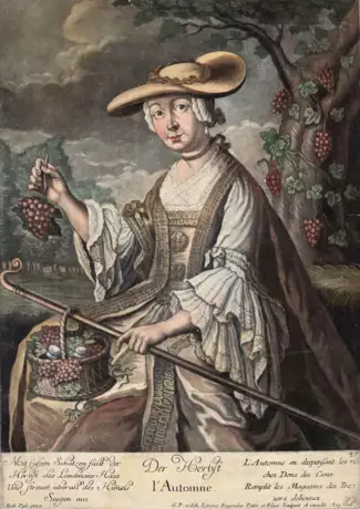 Zeigt eine Dame bei der Traubenlese. - Mit zweisprachigem (dt.-franz.) Text im Unterrand: "Mit süssen Schätzen füllt der Herbst des Landman(n)s Haus und streuet überall des Him(m)els Seegen aus". - Ob. Rand mit kl. Einriß.