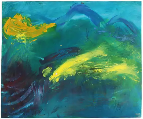 (1958 Wuppertal). Landschaft in Blau und Gelb. Öl auf leichtem Karton 2012 (?). Blgr. 37 x 45 cm. Unt. li. sign. u. undeutl. dat. - Leichte Gebrauchssp., 1 Farbabplatzung im Gelb.