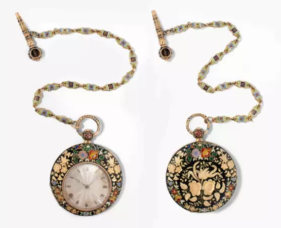 Zweischaliges Lépine-Gehäuse in 750 Gelbgold. Staubdeckel signiert und nummeriert "Jn. Fcois. Bautte & Cie à Genève, N 48818". Gehäuse reich verziert mit floraler Emaillierung in Champlevé-Technik. Exzentrisches Fenster, guillochiertes Silber-Zifferblatt mit römischen Ziffern, Minutenring und Bregue-Zeigern. Feuervergoldetes Werk mit Zylinderhemmung. Passende ornamental emaillierte Goldkette mit Uhrenschlüssel. 38 mm, Gesamtgewicht 30 g. Nicht funktionstüchtig.