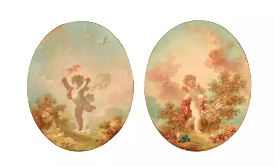 A significant part of his painting was devoted to the type of allegorical painting featuring putti that we find in this charming pair. This aspect of his work was extremely popular during his lifetime and continued to inspire others long after his death. We can site for instance the putti punctuating the allegories of night painted by Fantin-Latour (1836-1904) in the 1890s (La Nuit, Musée d'Orsay, Paris, inv. RF 1086) as an example of this enduring influence. These blond cherubs with their gleaming curls appear quite early in Fragonard's career. Often used in allegorical compositions for decorative schemes, they can be seen as early as 1758-1760. An early example is the Allegory of War, represented by cherubs perched on an ancient chariot, the sketch of which was once in the collection of the painter Natoire (1700–1777) (see J.-P. Cuzin, Fragonard, Life and Work, Fribourg, 1988, no. 64).