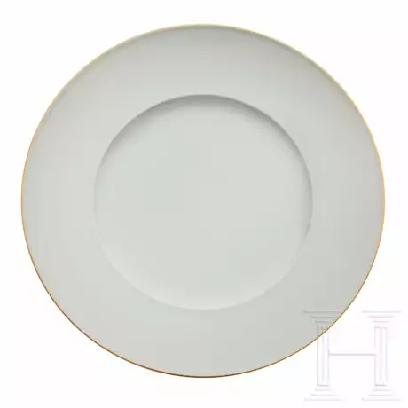 White-glazed porcelain dessert plate, finely gilded rim, reverse featuring Reich Foreign Minister insignia of large eagle surmounting globe and surrounded by oak leaf wreath in black, manufacturer's mark to K.P.M. of Berlin. Diameter ca. 17.5 cm.