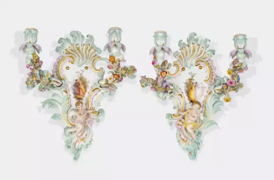 Lot 632 | Johann Joachim Kaendler (Fischbach/Sachsen 1706 - Meissen 1775). Paar Wandleuchter mit Amoretten.