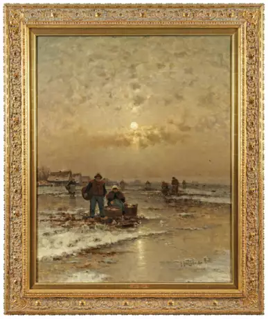 Typisches Werk des Landschaftmalers der Düsseldorfer Malerschule, welches die stille Geschäftigkeit der Muschelsucher an einem eisigen Wintertag an der holländischen Küste zeigt. Öl/Lwd.; R. u. sign.; 95 cm x 77 cm. Rahmen.