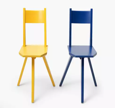 Entwurf um 1982 für Källemo AB, Schweden. Buche, blau bzw. gelb bemalt. Herstellerbezeichnung (Brandstempel). Sitzhöhe 46 cm. 41,5x40x83 cm.