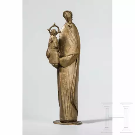 Vollplastisch ausgearbeitete Bronze einer im Stehen das Kind vorhaltenden Madonna. Die runde Plinthe unterseitig gebohrt. Höhe 34 cm.