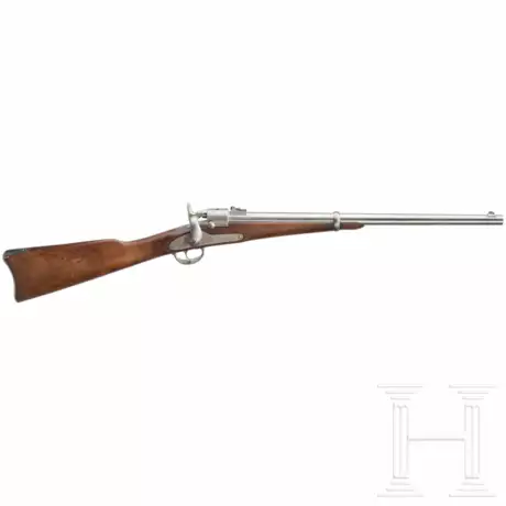 Cal. .56-50Spencer, SN. 14926, dreifach gezogener, blanker Lauf, Länge 22". Expressvisier mit einer Klappe. Schlossplatte mit dreizeiliger Firmierung "Joslyn Fire Arms Co./Stonington Conn./1864", an der Verschlussrückseite zwei Patente. Nussholzhalbschaft mit geringen Tragespuren, Kolbenschuhlappen gemarkt "U S", komplett mit Reitstange und Sattelring. Metalloberflächen fachmännisch gereinigt. Länge 98 cm.