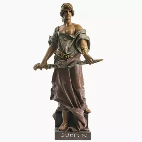 Stoneware, brown patinated. Coloured glaze. Gilt and silver decoration. Inscribed Judith. Inscribed H- J., F. Koenig (?) on the back. Damaged, one earring broken off. Height 98 cm.