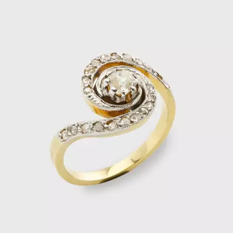 Gelbgold, 18 k. Zentral besetzt mit einer Diamantrose, spiralartig umzogen von korrespondierenden Diamanten (1 Stein fehlt). Gew. ca. 4,22 g.