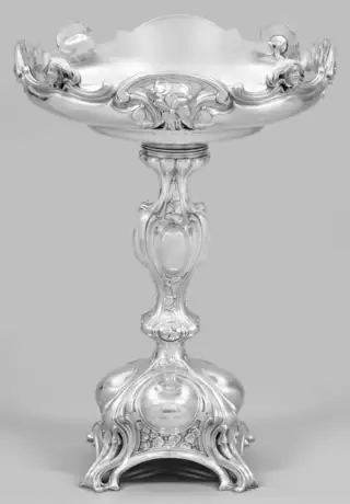 Silber. Über vier ausgestellten Füßen vierpassig gebuckelter Stand und Balusterschaft mit abnehmbarer, weit ausschwingender Kuppa mit durchbrochen gearbeiteter Wandung und Edelstahleinsatz. Fuß und Kuppa mit vegetabilen Ornamenten gerahmt und mit Kartuschen voller Blüten reliefiert. Rand mit plastisch gearbeiteten Damenköpfen verziert. Auf dem Stand schauseitig gravierte Inschrift "Der landwirtschaftliche Verein Osterode, Ostpr. seinem langjährigen Vorsitzenden Herrn von Heimendahl-Sleeendorf zur freundlichen Erinnerung an die Jahre 1867 - 1904", und rückseitig graviertes Wappen derer von Heimendahl unter Adelskrone. Minim rep.; Gest. 800, Herstellerzeichen. Gew. (ohne Edelstahl Einsatz) ca. 1615 g. H. 49 cm. D 36 cm.