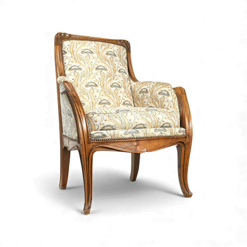 Circa 1920, wooden frame, probably walnut, with carved ornamental frieze, upholstered and covered with patterned jacquard fabric in beige, gold and anthracite tones, decorated with trim nails all around, cabriole legs, 103 × 68 × approx. 58 cm, seat height approx. 50 cm