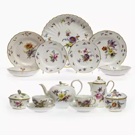 Kaffeeservice bestehend aus 12 Tassen mit 12 Unterschalen, 1 Kaffeekanne (ohne Deckel) H. 18 cm, 1 rd. Teekanne mit Deckel H.16 cm, 1 Mokka-/Wasser-/Milchkanne mit Deckel H. 16 cm, 1 rd. Zuckerdose H. 11,5, Dm.11,5 cm, 1 ov. Zuckerdose H. 10, L.11 cm, 12 Kuchenteller Dm 19,5 cm, 12 Gebäckteller Dm 15,5 cm, 1 ov. Anbietschale 23x15 cm, dazu 1 mittl. spitzwinkelige Schale 18x14 cm, 2 kl. spitzwinkelige Schalen 15x12 cm sowie 2 gr. rd. Kuchenteller mit kanneliertem Rand Dm 27 cm.