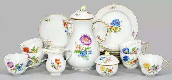 für 6 Personen. 15-tlg.; Kaffeekanne, Sahnegießer, Zuckerdose, 6 Kaffeetassen mit Untertassen, 6 Dessertteller. Form "Neuer Ausschnitt". Auf der Wandung und im Spiegel farbenprächtige Blumengebinde und Blüten in polychromer Malerei. Goldstaffage. Schwertermarke. Kannen-H. 24,5 cm.