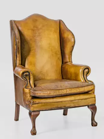 Mahagoni und braunes. Leder Trapezförmige Zarge auf geschwungenen Beinen mit Klauenfüßen. Gerundete Armlehnen sowie hohe, leicht zurückschwingende Rückenlehne mit geschweift ansteigendem oberen Abschluss und seitlichen Ohrenbacken. H. 117 cm. 83 cm x 75 cm. Sitz-H. 44 cm.