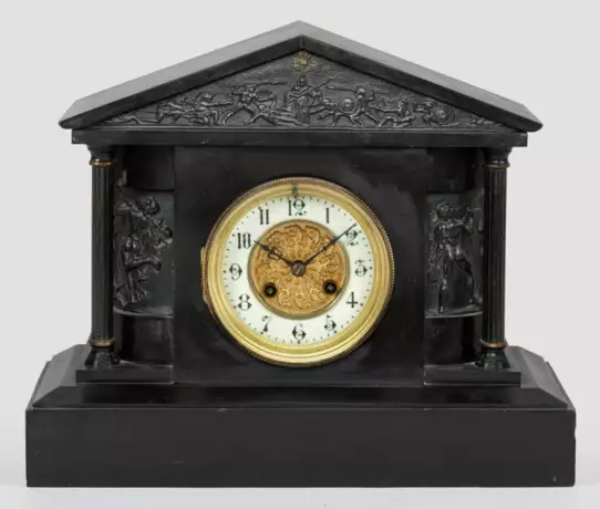 Schwarzer Marmor und schwarz lackierter Zinkguss. Über querrechteckig angelegtem Sockel architektonisch gegliedertes Gehäuse mit flachem Dachabschluss. Reliefplastisch gestaltete Figurenfriese. Verglastes Zifferblatt. Pendulenwerk mit Pendelfeder sowie Schlagwerk auf Tonfeder. Platine bez. Jules-Rolez Limited. H. 28 cm. 43 cm x 13,5 cm