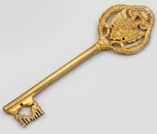 Messing, vergoldet. Hohldorn mit durchbrochen gearbeitetem Bart. Durchbrochen gearbeitete Riede, darauf von Blattkranz gerahmt ein gekrönter Doppeladler mit Heiligenscheinen, zentral auf seiner Brust vorderseitig die Initialen “JII” für Joseph II (1741 - 1790) und rückseitig “MT”, seine Mutter Maria Theresia (1717 - 1780). L. 18 cm.