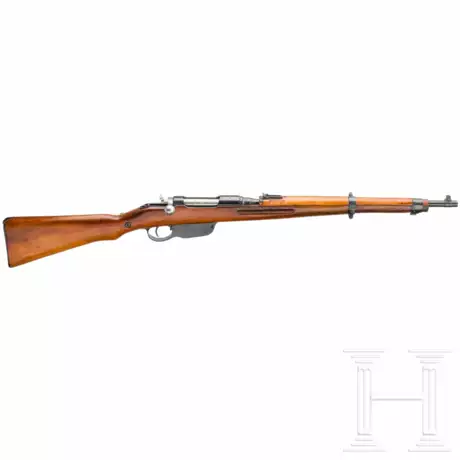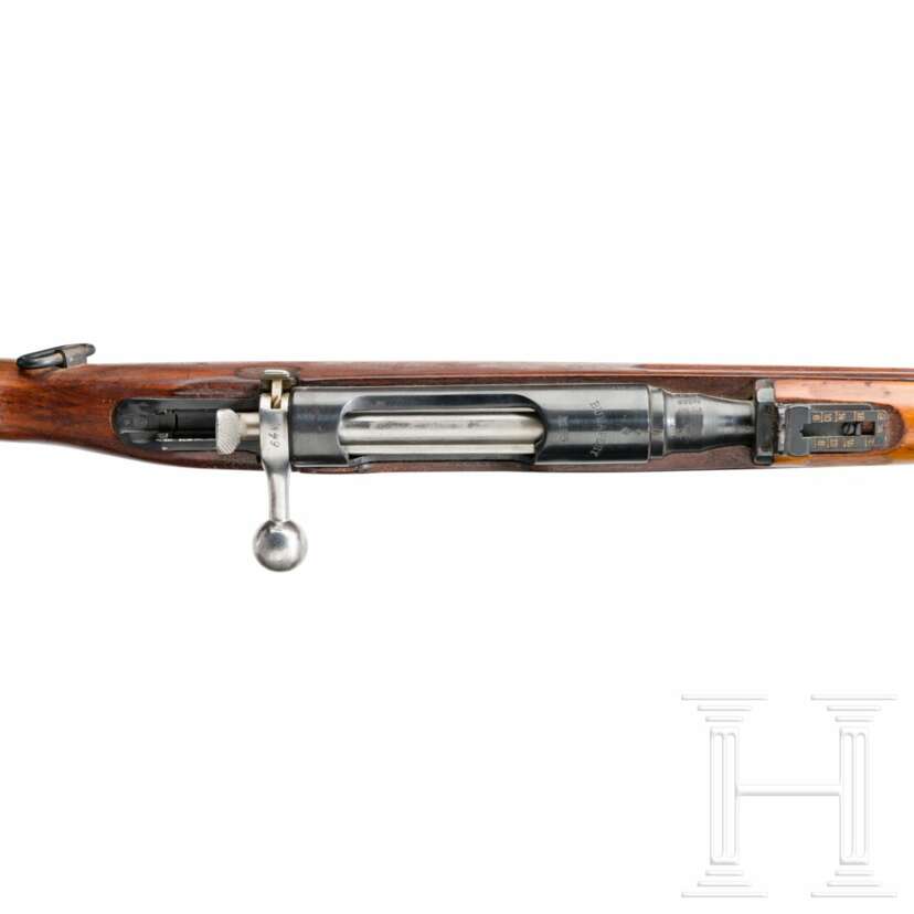 Cal. 8x56R Mannl, SN. 1849F, nummerngleich. Blanker Lauf, Länge 49 cm, deutscher Beschuss 1995. Erneuerte Brünierung von Lauf, Schlosshülse und Magazin. Schloss blank poliert. Überarbeiteter, heller Nussholzschaft. Länge 100 cm.