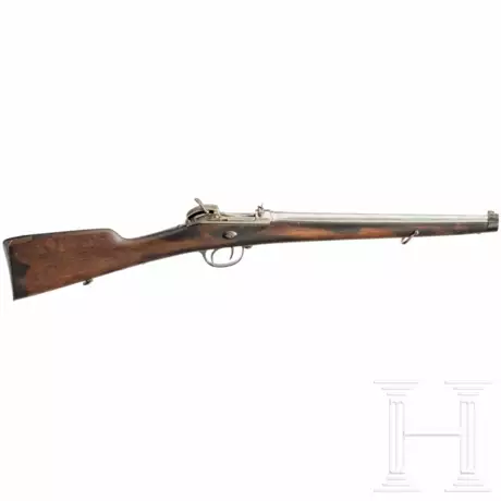 Cal. 11,5x35Werder, SN. 354, nummerngleich. Lauf rau. Standvisier mit nummerngleicher Klappe. Herstellungsdatum 1871, Indienststellung 1872. Truppenstempel "6.Ch.1". Alle Teile gebürstet, blank, Laufabschlussring und Abzugsbügel neu brüniert. Gereinigter abgezogener Nussholzschaft mit Riemenbügel und Riemenknopfschraube. Länge 81 cm.