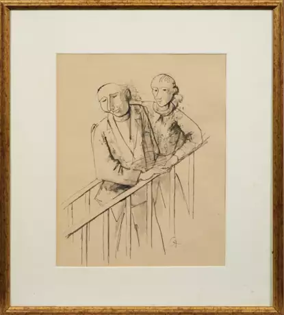 Um 1945-1947 entstandenes Blatt Hofers, der in jenen Jahren mehrfach Figuren auf Treppen schilderte. Dargestellt ist ein älterer Mann, der in enger Beziehung dicht neben einem jüngeren Mann steht, verbunden durch übereinander gelegte Hände. Außer dem Lebensalter- und Freundschaftsmotiv ist es auch als Vater-Sohn-Beziehung interpretierbar, zugleich als Hommage an das berühmte Gemälde "Bauhaustreppe" von Oskar Schlemmer aus dem Jahr 1932. Schlemmer war 1933 zusammen mit Hofer als Lehrer an den Vereinigten Staatsschulen für freie und angewandte Kunst in Berlin entlassen worden. Im "Dritten Reich" wurden Hofers Werke als "entartet" verfemt, er selbst wurde 1938 aus der Akademie der Künste ausgeschlossen. Nach dem Kriegsende übernahm Hofer 1945 das Direktorat an der Hochschule für Bildende Künste in Berlin. Die Bedeutung Hofers liegt in seinem persönlichen, sensiblen, allgemeingültigen Menschenbild fern von jeglichem Pathos. Feder u. lavierte Tusche/Papier. R. u. Ligaturmonogr. "CH". 50 cm x 35 cm. Rahmen.
