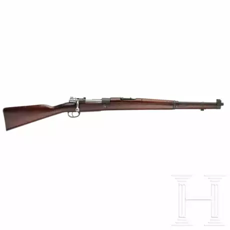 Cal. 7,65x53Arg, SN. 009926, nummerngleich. Fast blanker Lauf. Dt. Beschuss 1990. Auf der Hülse das argentinische Wappen, links ,,F.M.A.P. / Mauser Mod. 1909". An der Führung gemarkt ,,Direccion General De / Fabricaciones Militares". Schiebevisier bis 1400 m. Vollständige neue Brünierung mit schwachen Tragespuren. Schloss weiß poliert. Dunkler Nussholzschaft mit geringen Tragespuren, gereinigt. Selten angeboten. Länge 108 cm.