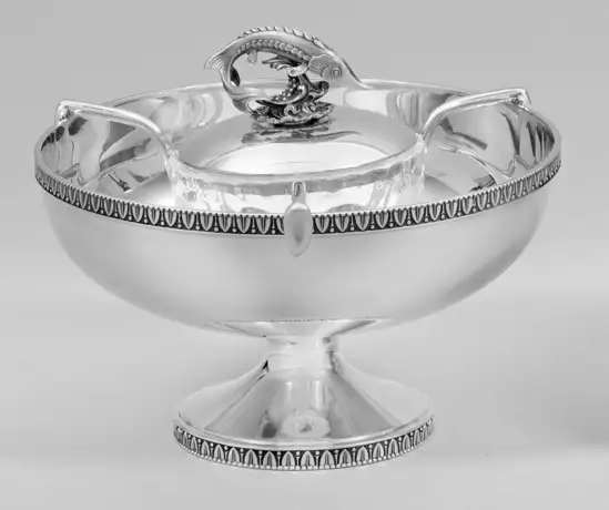 Sterlingsilber, Glas. Runde Fußschale mit kurzem Schaft, weit ausschwingender Kuppa und reliefiertem Rand und Stand. Darin einsetzbare, dreiarmige Halterung für weitere, kleinere Glasschale mit Silberdeckel, bekrönt von vollplastischer Stördarstellung. Gest. 925, Herstellerzeichen. Gew. ohne Glaseinsatz ca. 375 g. H. 12 cm. D. 15 cm.