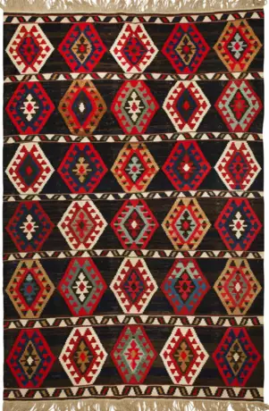 Persien. Wolle auf Wolle, flach gewebt. Flächendeckende Musterung aus schmalen Streifen mit Wellenband sowie unterschiedlich farbigen Rautenmotiven auf schwarz-braunem Fond. 195 cm x 303 cm.