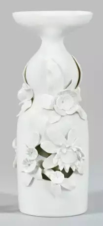 A white glazed porcelain candlestick with applied flowers and leaves. Crossed swords mark.