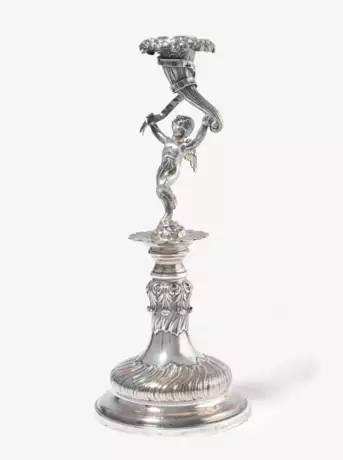 Silber (Bodenplatte Metall). Gewölbter Rundfuss, darüber kurzer Schaft und Puttofigur, ein Horn mit Tülle empor haltend. Reliefierter Blatt- und Früchtedekor. Garantiemarke. Feingehalt 915. H 26,4 cm.