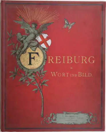 Enthält: Ansicht vom Jägerhaus aus gesehen, Münster vom Schloßberg aus, evangelische Kirche, Herzog-Berthold-Brunnen, Siegesdenkmal, Rathaus u. Universität, Kaufhaus, Schwabentor, Loretto-Kapelle, Güntherstal. - Text etw. braunfleckig, Heftklammern angerostet.
