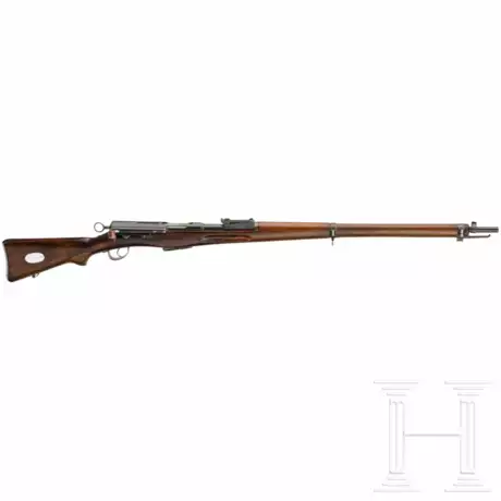 Kal. .22lr, Nr. 46258, nummerngleich. Blanker Lauf. Einzelladerbüchse. Am Laufansatz gemarkt mit "Bern". Originale Brünierung. Schiebevisier, skaliert 3 - 20. Dunkler Nussholzschaft mit leichten Gebrauchsspuren, rechts im Kolben Vertiefung der Maße 5 x 3 cm für eine Plakette. Messing-Laufdeckel. Länge 131 cm.