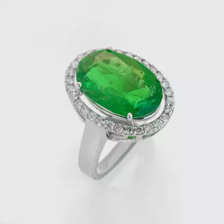 Weißgold, gest. 585. Zentral besetzt mit einem Smaragd von ca. 6,53 ct. im Ovalschliff, entouriert von Diamanten von zus. ca. 0,48 ct.; Gew. ca. 4,97 g.