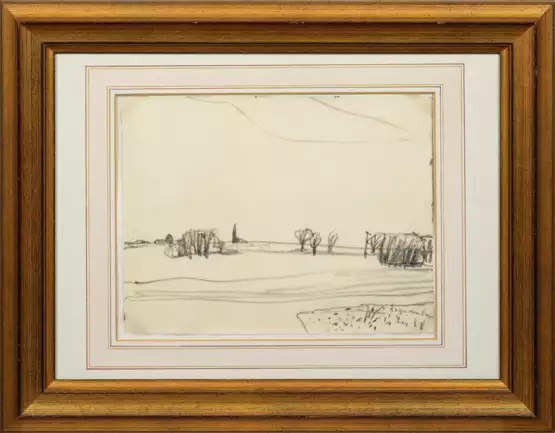 Rasch skizzierte Landschaftsimpression aus Brandenburg. Schwarze Kreide/Papier. R. u. monogr., bez. u. dat. (19)88. 23,6 cm x 29,5 cm. Rahmen..