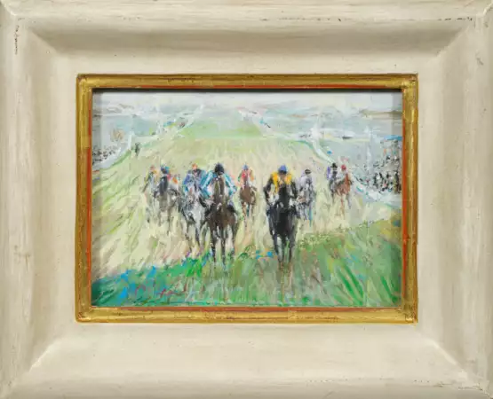 Impressionistisch aufgefasste Darstellung. Klaus Philipp, der als einer der besten zeitgenössischen Pferdemaler gilt, befasste sich seit seiner Jugend mit Pferden. Schon neben seiner Tätigkeit als Polizeireiter und Leiter der berittenen Polizei in Stuttgart widmete er sich der Pferdemalerei. 1980 schied er aus dem Polizeidienst aus und wandte sich ganz seiner Passion zu. Hierbei stellte er zahlreiche legendäre Pferde und ihre Reiter dar, teilw. im Auftrag ihrer vermögenden, prominenten, internationalen Besitzer und stellte vielfach aus. Wachskreide und Ölpastell/geklebtes, mehrteiliges Papier auf Karton. L. u. sign.; verso auf dem Rückseitenschutz vom Künstler sign., betitelt u. dat. 1993. Sichtmaß 9,5 cm x 13,4 cm. Rahmen.