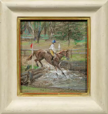 Impressionistisch aufgefasste Darstellung. Klaus Philipp, der als einer der besten zeitgenössischen Pferdemaler gilt, befasste sich seit seiner Jugend mit Pferden. Schon neben seiner Tätigkeit als Polizeireiter und Leiter der berittenen Polizei in Stuttgart widmete er sich der Pferdemalerei. 1980 schied er aus dem Polizeidienst aus und wandte sich ganz seiner Passion zu. Hierbei stellte er zahlreiche legendäre Pferde und ihre Reiter dar, teilw. im Auftrag ihrer vermögenden, prominenten, internationalen Besitzer und stellte vielfach aus. Wachskreide/Büttenpapier. Verso vom Künstler sign. u. betitelt. Sichtmaß 14 cm x 13 cm. Rahmen.