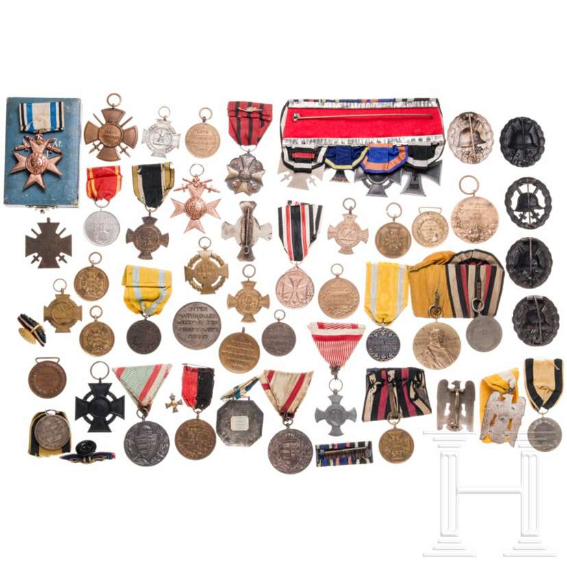 Eine vierteilige Ordensschnalle mit EK 2, Oldenburger FA-Kreuz (Eisen), Kriegsverdienstkreuz 2. Klasse und FEK (Eisen, "W.K."). Eine zweiteilige Schnalle mit KD 1870/71 für Nichtkämpfer (nichtmagnetisch) und Jubiläumsmedaille 1897. Ein bayerisches Militärverdienstkreuz 3. Klasse mit Schwertern und Bandabschnitt im Etui von Hemmerle München sowie ein Exemplar ohne Etui. Ein Bundesehrenzeichen des Bayerischen Kriegerbundes. Vier Kriegsdenkmünzen 1870/71, eine an Schnalle mit blauem Band der Landwehr-Dienstauszeichnung. Vier schwarze und ein silbernes Verwundetenabzeichen, jeweils hohl geprägt. Zwei schwarz emaillierte Schlesische Bewährungsabzeichen (jeweils nichtmagnetisch). Zwei bronzene und eine silberne Friedrich-August-Medaille. Zwei Erinnerungskreuze 1866 Königgrätz, ein Kreuz Mainarmee und Düppeler Sturmkreuz 1864. Eine Hohenzollern-Denkmünze für Kämpfer 1848 - 1849. Ein preußisches Kriegserinnerungskreuz 1914 - 1918 für Kämpfer. Eine Bronzemedaille "Signum Memoriae", ein Militär-Jubiläumskreuz, zwei ungarische patriotische Medaillen 1914 - 1918 und ein Verdienstkreuz FJ 1916. Außerdem ein österreichisches Kriegsband (Kopie). Zwei württembergische Tapferkeitsmedaillen, drei badische Medaillen etc. Teilweise am Band, Emaille gechipt, partiell leicht beschädigt, Altersspuren.