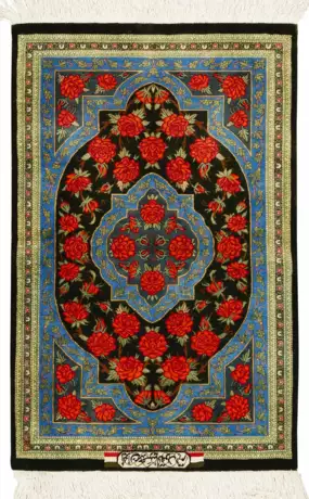 Persien. Seide auf Seide. Feine Knüpfung. Ca. 1 Mio Knoten pro qm. Auf dunklem Fond kartuschenförmiges Innenfeld und entsprechendes Medaillon mit flächendeckender Musterung aus Rosenblüten. Umlaufend schmale, mehrteilige Bordüre. Sign.; 91 cm x 57 cm.