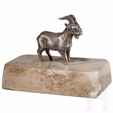 Silber. Vollplastisch gearbeitete Hausziege mit graviertem Fell. Ihre Augen sind mit zwei Rubincabochons besetzt. Ein Bein mit Pseudomarken (Beschauzeichen mit Feingehalt "84" und Meistermarke "I.P."). Maße 5,7 x 6,4 cm, Gewicht 164,16 g. Dazu ein Steinsockel. Maße 2,9 x 11,5 cm.