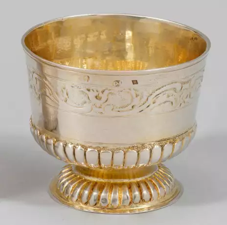 Silber, voll vergoldet. Runder, aufgewölbter Stand, übergehend in kurzen, stark eingezogenen Schaft und weit ausschwingende, gering konisch aufsteigende, glatte Kuppa. Stand und Kuppaansatz umzogen von zungenfriesähnlichen Godronen. Unterhalb des durch zarte Profillinien abgesetzten Randbereichs eine breite Bordüre verziert mit reliefplastischen Volutenranken. Gest., Beschauzeichen, Meister Johann Philipp Gross (wird Meister 1689), Repunzierung für Österreich, Wien bis 1824. Gew. ca. 110 g. H. 6,5 cm.