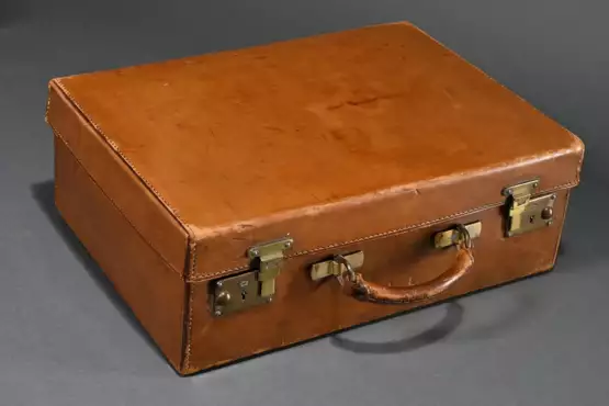 Small brown vintage leather suitcase with embossed monogram ‘HIL’, light linen interior, England, early 20th century, 16x45x32.5cm, slight signs of use