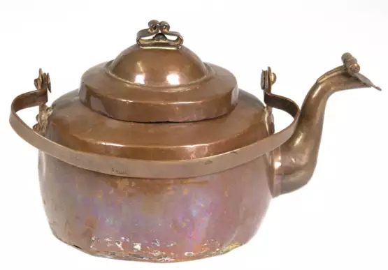 Lot 602 | Kleiner Kupfer-Kessel, 19. Jh., Klapphenkel, Bodenrand mit Löchern, Deckel ergänzt, H. 13,5 cm