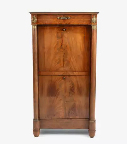 Frankreich, 19.Jh., Empirestil. Mahagoniholz. Rechteckiger Korpus mit zwei aufklappbaren Platten, oben Schublade. Seitliche Ziersäulen mit Messingkapitellen. Platte aus weissem, grau geädertem Marmor. Bronzebeschläge. Innen zwei Schubladen und Fach mit seitlichen Ziersäulen. Schreibplatte mit grünem Leder bezogen.