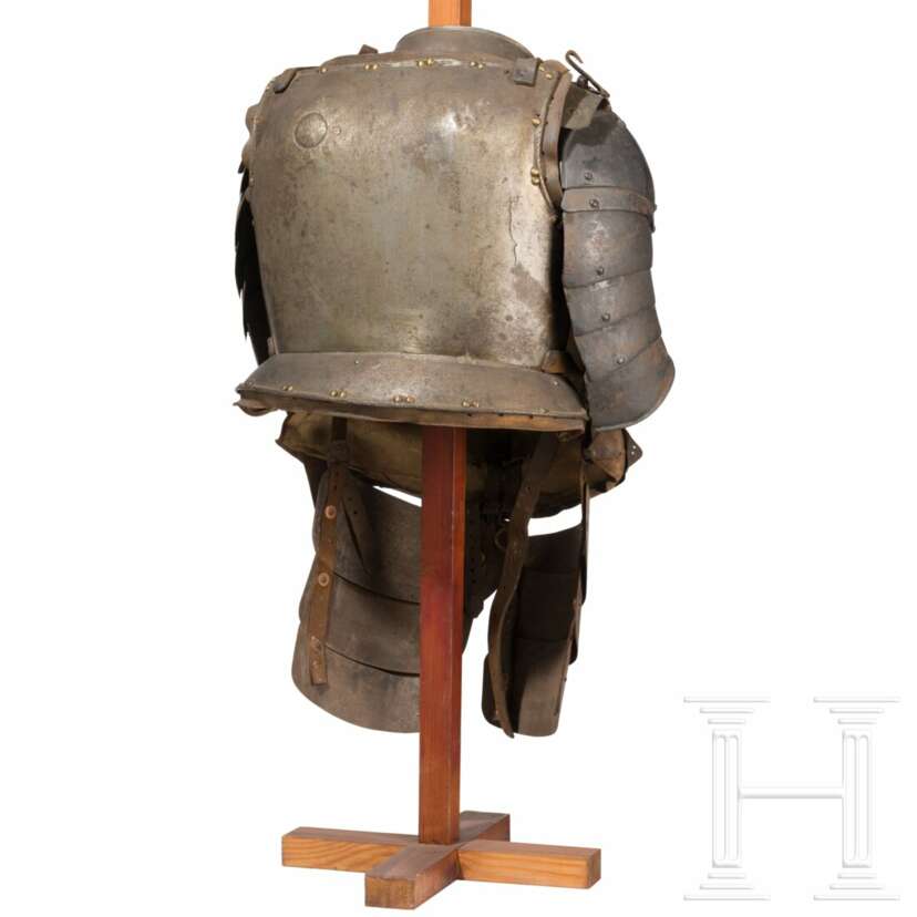 Neuzeitlicher, im Scharnier zu öffnender Kragen mit leicht gegrateter Platte, anhängende, sechsfach geschobene Schultern. Gegratete Brustplatte mit angedeutetem Tapul, Rücken (nicht zusammengehörig) mit alter Reparatur im Schulterbereich und Delaminierung rechts. Arm- und Halsausschnitte mit gebördelten Rändern bzw. Brust mit etwas beschädigtem Brechrand. Angenietete Bauch- und Gesäßreifen, neuzeitlich ergänzte, dreifach geschobene Beintaschen. Brust und Rücken innen mit an Lederstreifen befestigtem Leinenfutter. Alters- und Gebrauchsspuren, Schultern beschädigt. Gesamthöhe 76 cm.