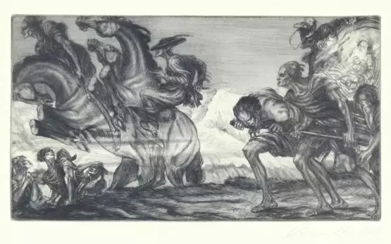 ╔Dabei: Vladimir Silovsky╗, Puppentheater, auf der Bühne Gespenst mit Totenkopf. Holzschnitt, ca. 20,7 x 27,7 cm. Sign. - ╔Josef Prokop╗ Stillende Madonna im Walde, Holzschnitt. Um 1910. 33,3 x 26,7 cm. Sign.