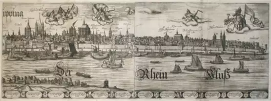 Seltenes Köln Panorama. Im vorliegendem Exemplar ist die rechte Hälfte und das linke Blatt der seltenen Ansicht vorhanden. Unten mit 18 (v. 24) der Gaffelwappen.