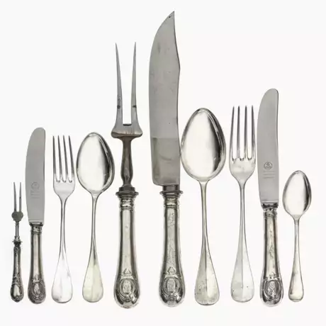 Besteck bestehend aus 12 Menümessern,12 Menügabeln, 16 Menülöffeln, je 12 Vorspeisenmesser, -gabeln, -löffel, je 1 Suppenkelle, Saucenkelle, Tortenheber, 2 gr., 2 kl. Vorlegelöffel, 1gr. und 2 mittl. Tranciergabeln, 1 gr. Fleischmesser. Diese glatten Teile zeigen am tropfenförmigen Griffende mit Mittelsteg vorder- oder rückseitig in einer ovalen Kartusche das ligierte Monogramm "WM" (oder "MW"?). Zudem 1 Menümesser, 2 kl. Vorlegegabeln und 11 Kaffeelöffel ohne Monogramm.