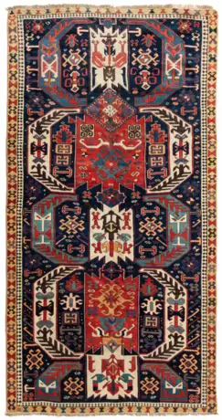 S-Kaukasus, um 1900. Grosszügig angelegte Wolkenbänder in Hellblau und Weiss umspannen auf nachtblauem Grund mehrere rot-weisse Polygone, wirkungsvoll flankiert von Hakenrauten und weiteren Kazak-Elementen. Eine braun-weisse reziproke Medachyl-Innenbordüre sowie eine gelbe Stundenglas-Aussenbordüre säumen das Feld und bilden einen schönen farblichen Kontrast. Um den Teppich herum ist eine Bordüre entfernt worden. Alte reparierte Stellen, Gebrauchsspuren. 135x262 cm (ft. 4.5x8.6).
