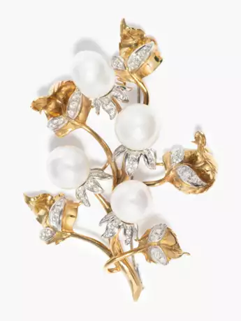 1950er Jahre. 750 Weiss-/Gelbgold. Als Blütenzweig stilisierte Brosche mit vier Südsee-Kulturperlen, 11-14 mm, Blütenblätter und Laubblätter mit Brillanten, zus. ca. 1 ct. L 8x6 cm, 45 g.
